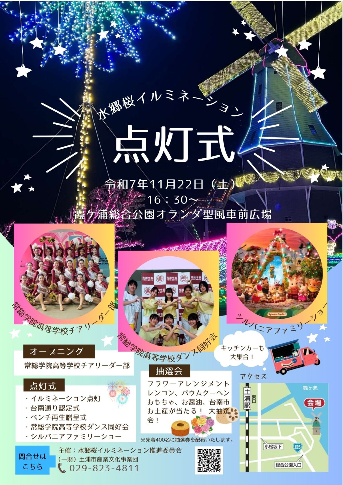 11月22日(土)16:30より、霞ヶ浦総合公園で行われる 「水郷桜イルミネーション点灯式」 に、本校の チアリーダー部とダンス同好会が出演します。
