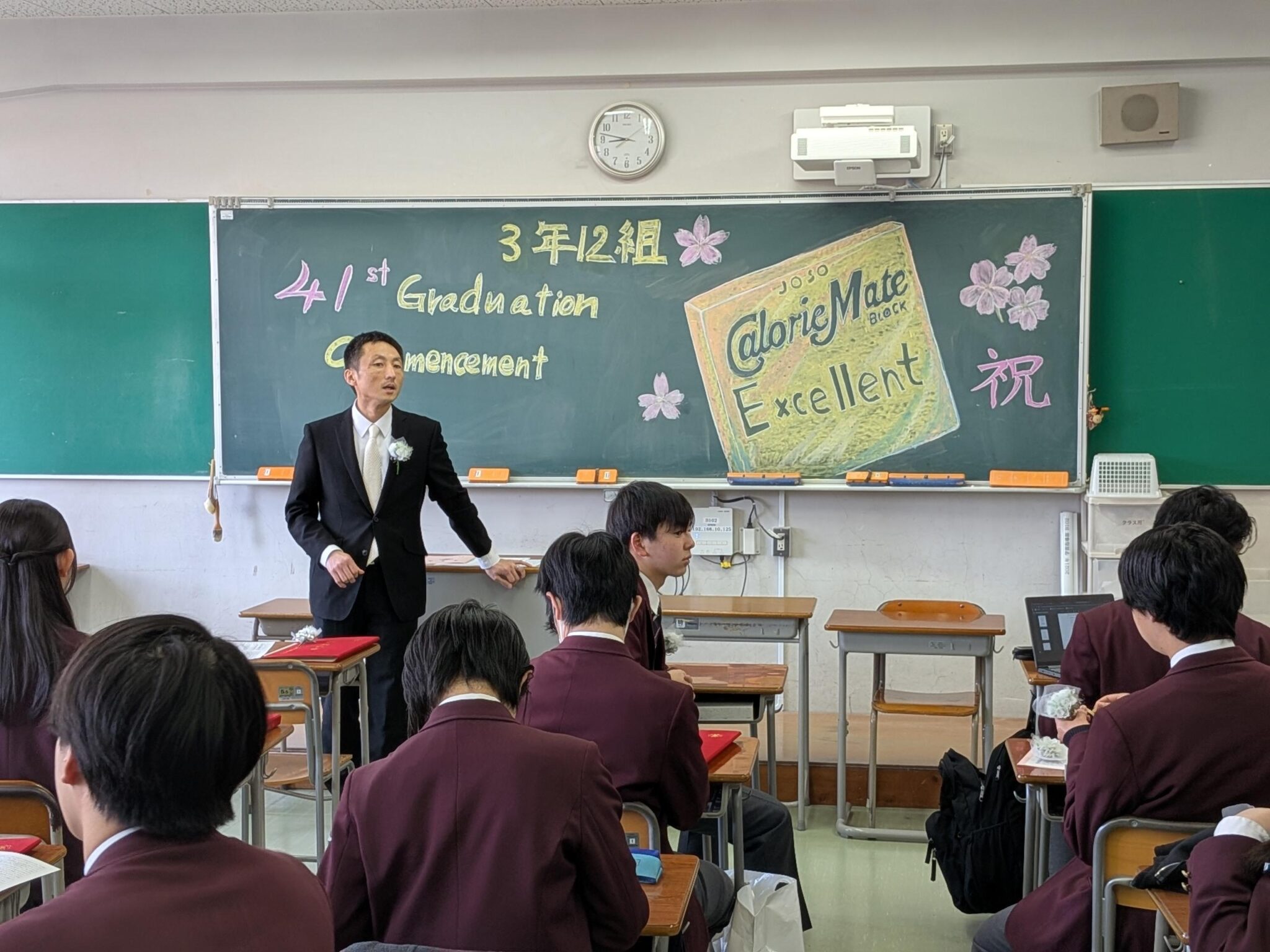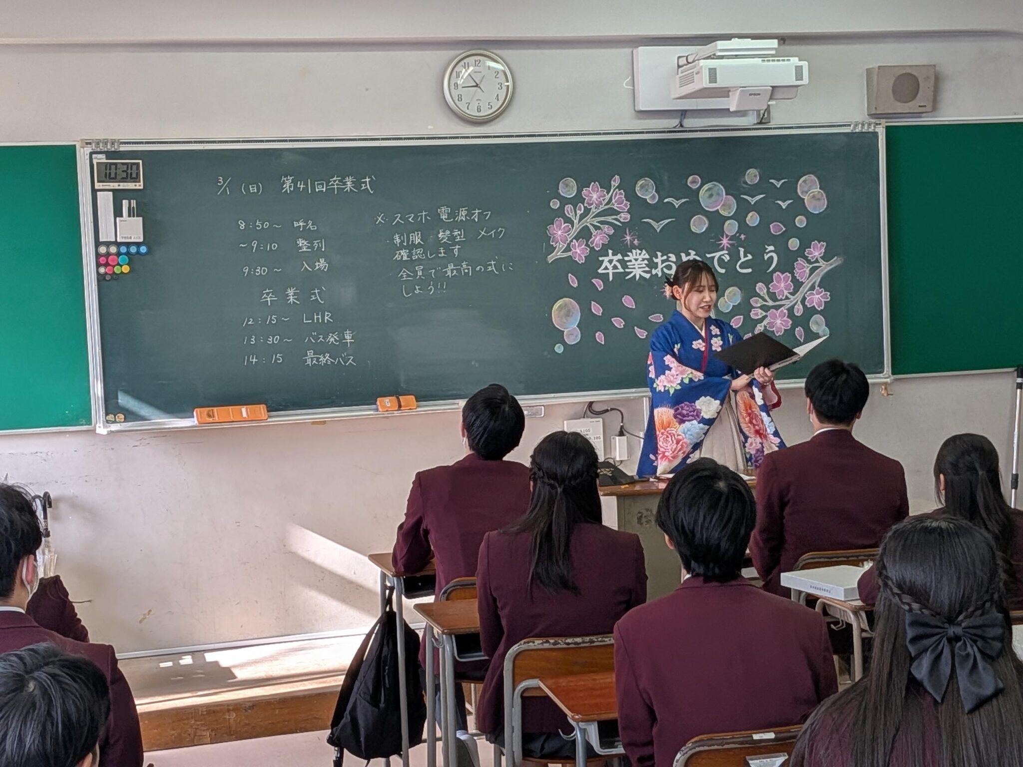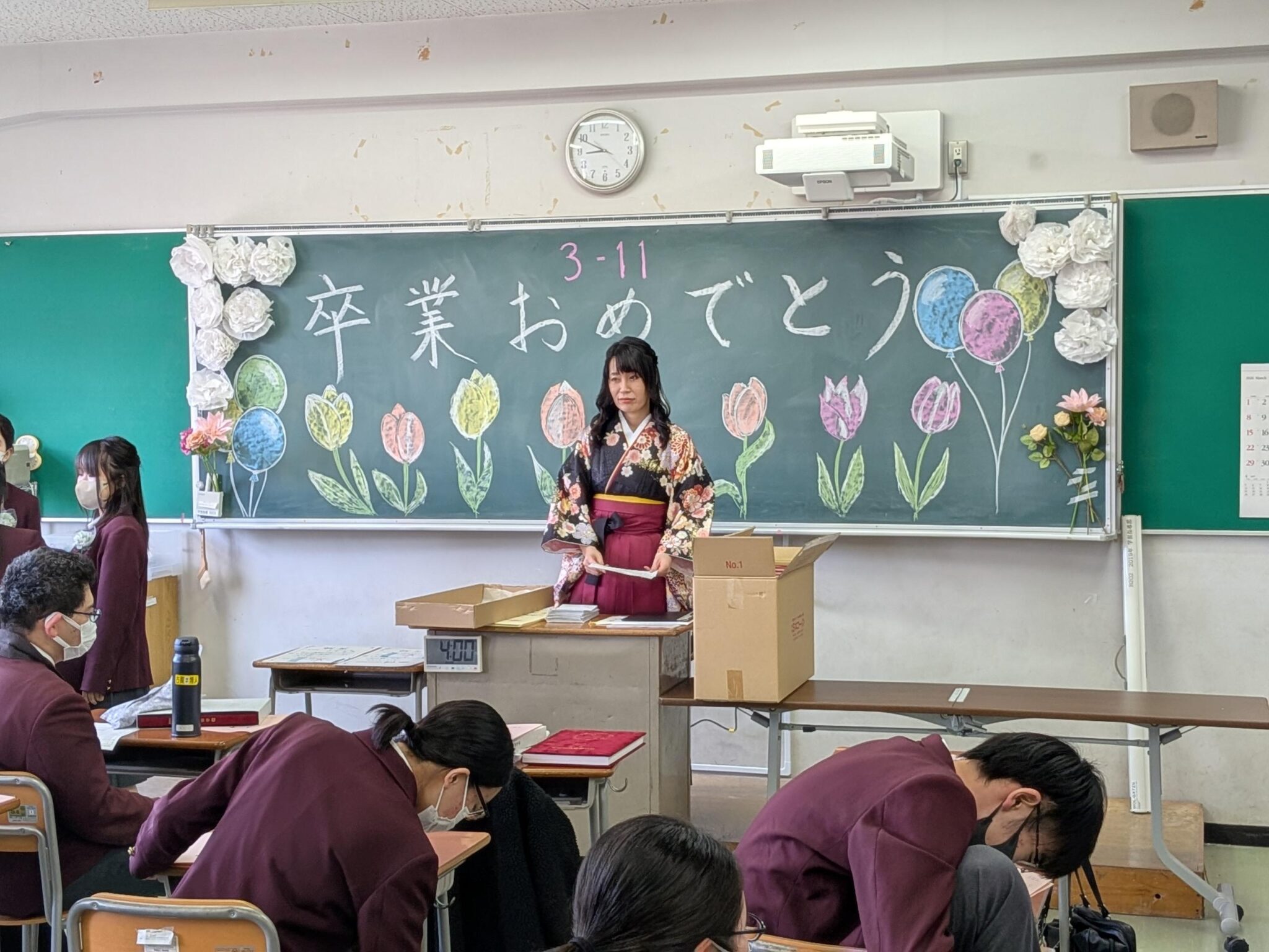 担任から一人ひとりに思いが込められた最後のホームルームでは、三年間の歩みを振り返りながら、教室が温かな拍手と涙に包まれる感動的な時間となりました。