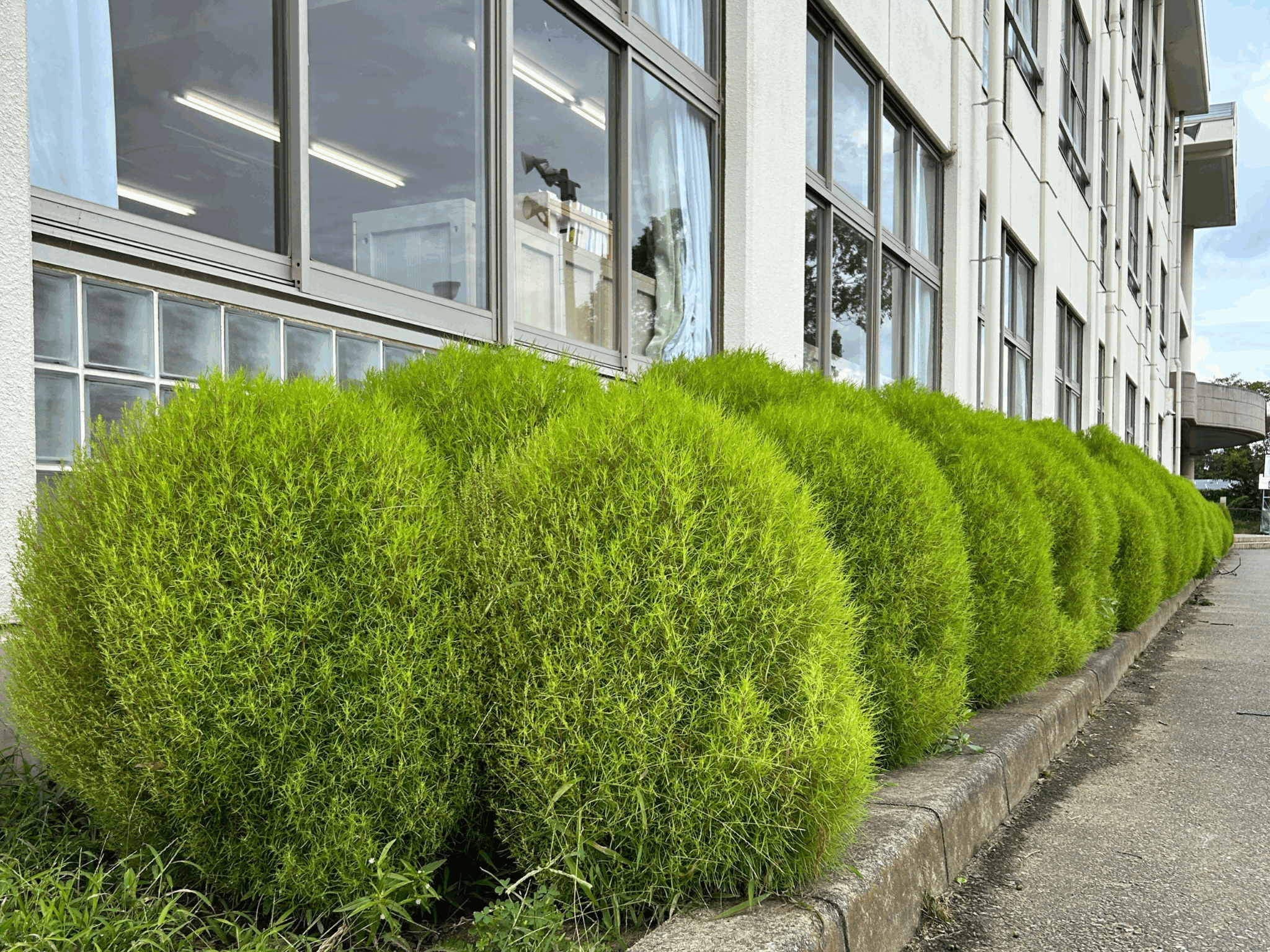 昨年度、土浦市花いっぱい運動コンクールにおいて「まなびやキラリ賞」を受賞した本校の花壇に、今年度は見事なコキアが育っています。10月頃から赤く染まり始めるコキアですが、現在は緑いっぱいのコキアが生徒たちの登下校を見守ってくれています。