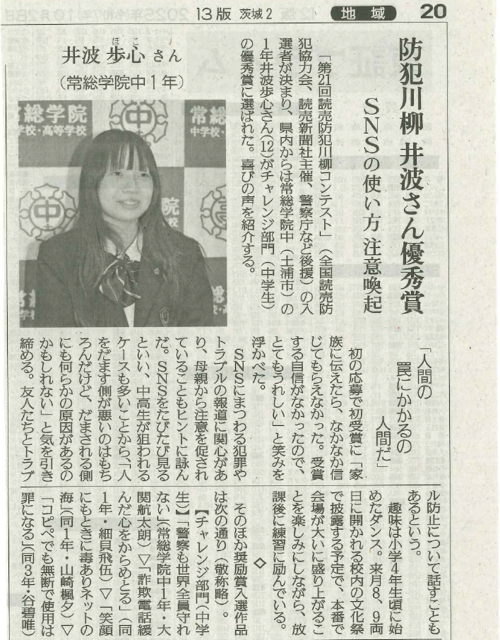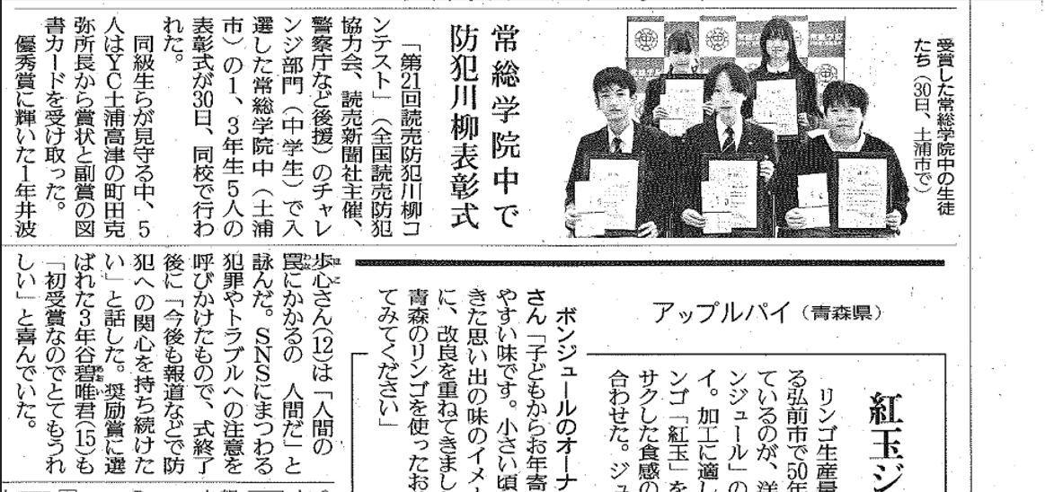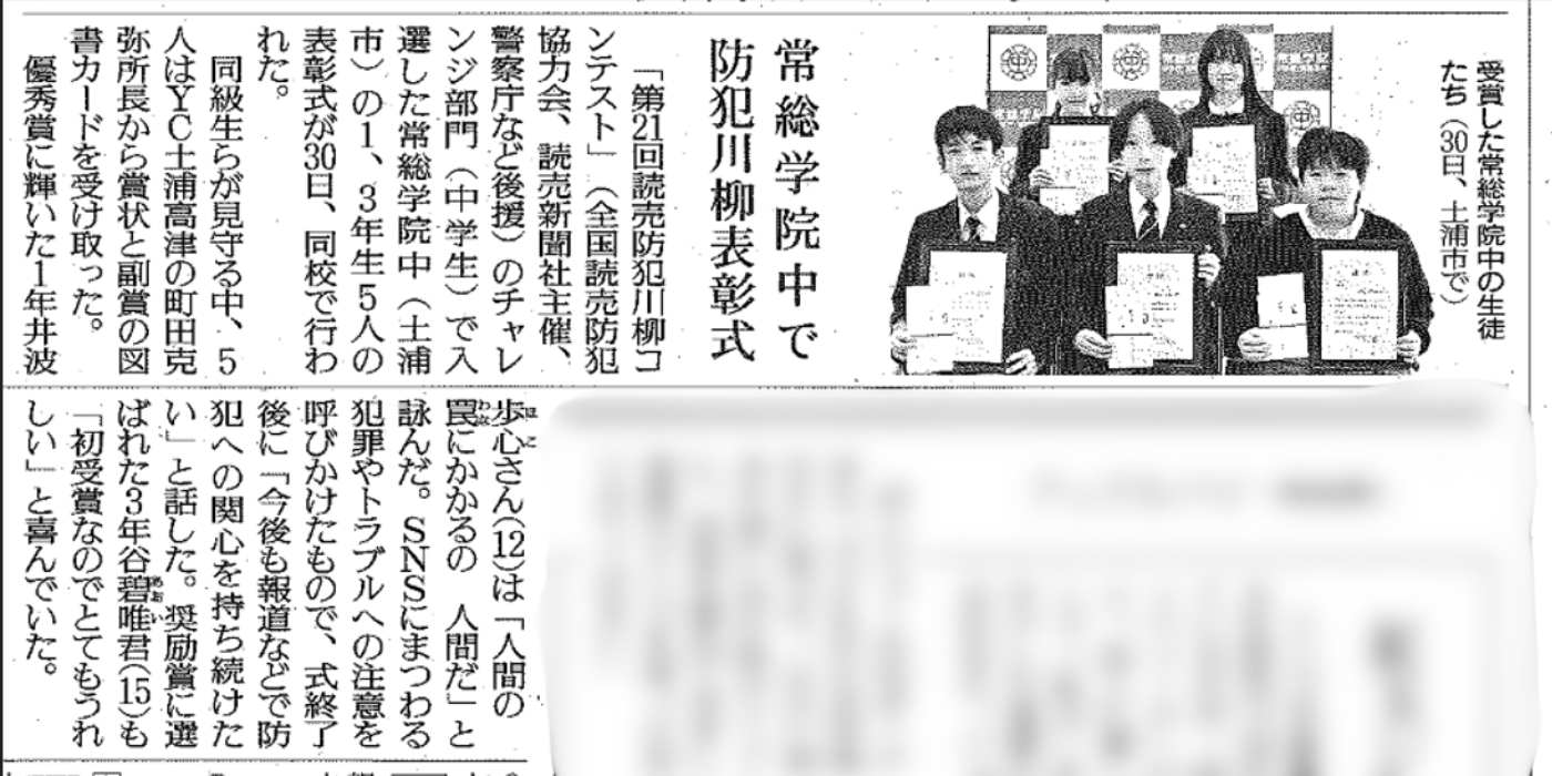 第21回読売防犯川柳コンテストのチャレンジ部門において、本校生徒5名が優秀賞と奨励賞を受賞しました。